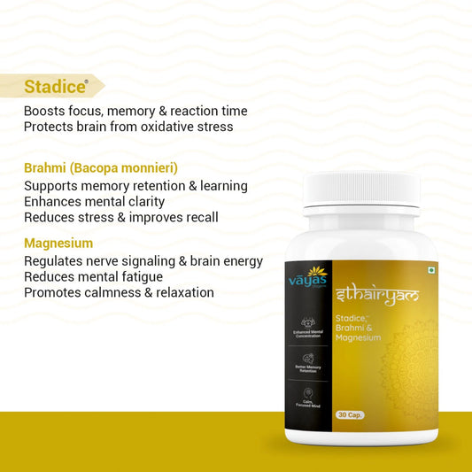 Vāyas Sthairyam | Cognitive Support for Focus, Memory & Calm | With Stadice®, Brahmi & Magnesium